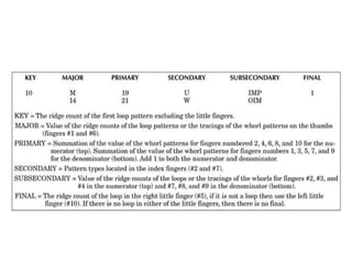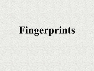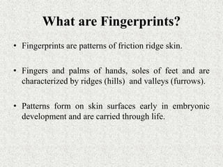 Fingerprints are unique patterns of friction ridge skin that develop in fetuses and remain unchanged throughout life unless altered by decomposition. They can be classified into three basic patterns: arches, loops, and whorls, and are collected using various methods such as rolling prints and chemical enhancement. Automated systems like AFIS assist law enforcement in identifying fingerprints from crime scenes, utilizing techniques for both the development and recognition of latent prints.