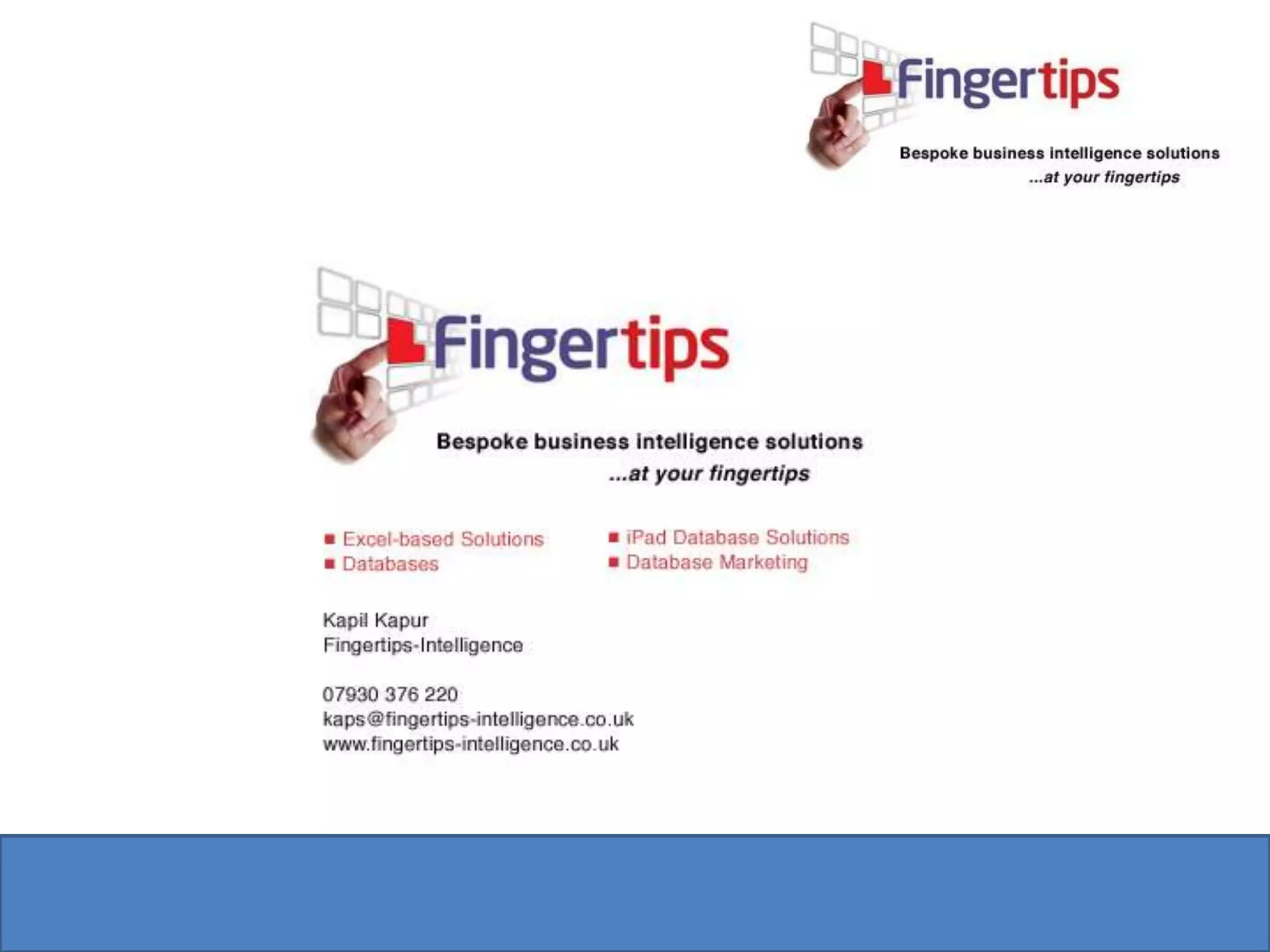 Fingertips Intelligence helps companies manage data more effectively by automating reporting processes and replacing disparate Excel spreadsheets with single database solutions. They helped an investment firm migrate their asset valuations, cash movements, trades, and other financial data from multiple Excel spreadsheets into a Filemaker database solution. This automated calculations and generation of client reports, saving extensive time and improving data quality over the firm's previous manual processes.