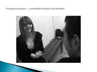 The document describes the conventions used in a student-made thriller media product. It establishes a realistic setting and builds suspense through the protagonist's daily actions. Flashbacks are shown in black and white to add mystery. Mood is set using lighting changes and an eerie soundtrack. The character is presented ambiguously to confuse the audience's understanding of him. The film draws from conventions of psychological thrillers like Se7en and Psycho to challenge expectations.