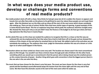 The media product is a chase scene opening for a thriller film. It uses conventions from films like James Bond Casino Royale by starting with an explosive chase scene to grab audience attention. Some conventions included are the smallest character being chased and the biggest character delivering the final hit. The group faced challenges like illness and no-shows that required changing plans and taking on new roles, but they worked hard and used skills learned from their preliminary task to complete the project successfully.
