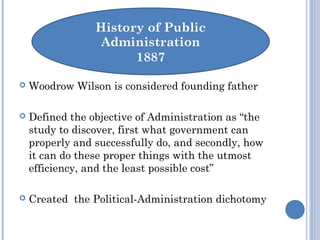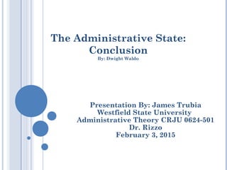 This document summarizes Dwight Waldo's work on the "Administrative State" which challenged prevailing views of public administration in the 20th century. Waldo argued that the political-administration dichotomy proposed by Woodrow Wilson was false and that administration is at the core of modern democratic government. He believed democratic theory must address administration and administrative theory must address democratic politics. Waldo also argued that efficiency cannot remain the sole focus of public administration as it is a political claim that can undermine democratic values and participation.