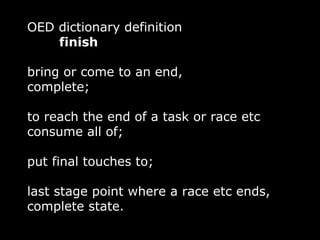 The document discusses different perspectives on when a piece of work is considered "finished". It explores definitions of finishing from dictionaries, considers how the idea of a finished state may apply differently to various materials like textiles. It prompts the reader to think about the roles of the maker and viewer in determining when a work is finished, and suggests creating equations or diagrams to represent the concept of finishedness.