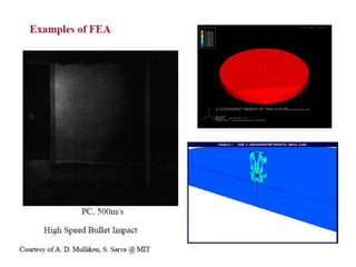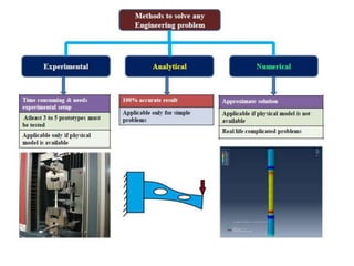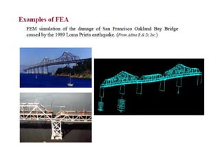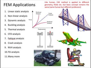 This document provides an overview of finite element analysis (FEA). It defines FEA as a numerical method for solving governing equations over the domain of a continuous physical system that is discretized into simple shapes. It lists several common structural and non-structural applications of FEA, such as stress analysis, buckling problems, vibration analysis, and heat transfer. Finally, it provides the course outline, textbooks, references, and some common FEA software packages.
