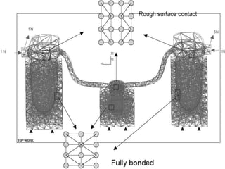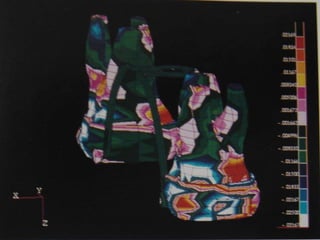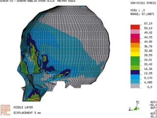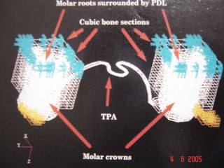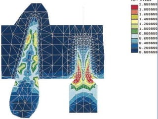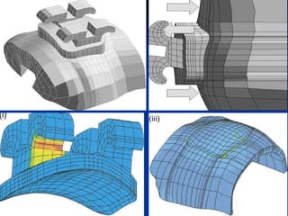 Finite Element Analysis (FEA) was developed in the 1960s to solve aerospace structural problems. It has since been introduced to orthodontics and other dental fields. FEA involves dividing a complex problem into smaller, simpler elements and using shape functions to interpolate variables. Each element is assigned material properties. The computer program then calculates element stiffness, solves matrix equations, and outputs displacement, stress, and other results. FEA allows modeling of complex biological structures like teeth and bone. It has provided insights into stress distributions and tooth movement from various orthodontic appliances and mechanics.