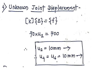 3) It shows an example problem where the displacements and forces in each spring are determined when a 5N force is applied to the free end of the assembly. The analysis involves forming the stiffness matrix, applying boundary conditions, solving the equilibrium equations, and calculating the