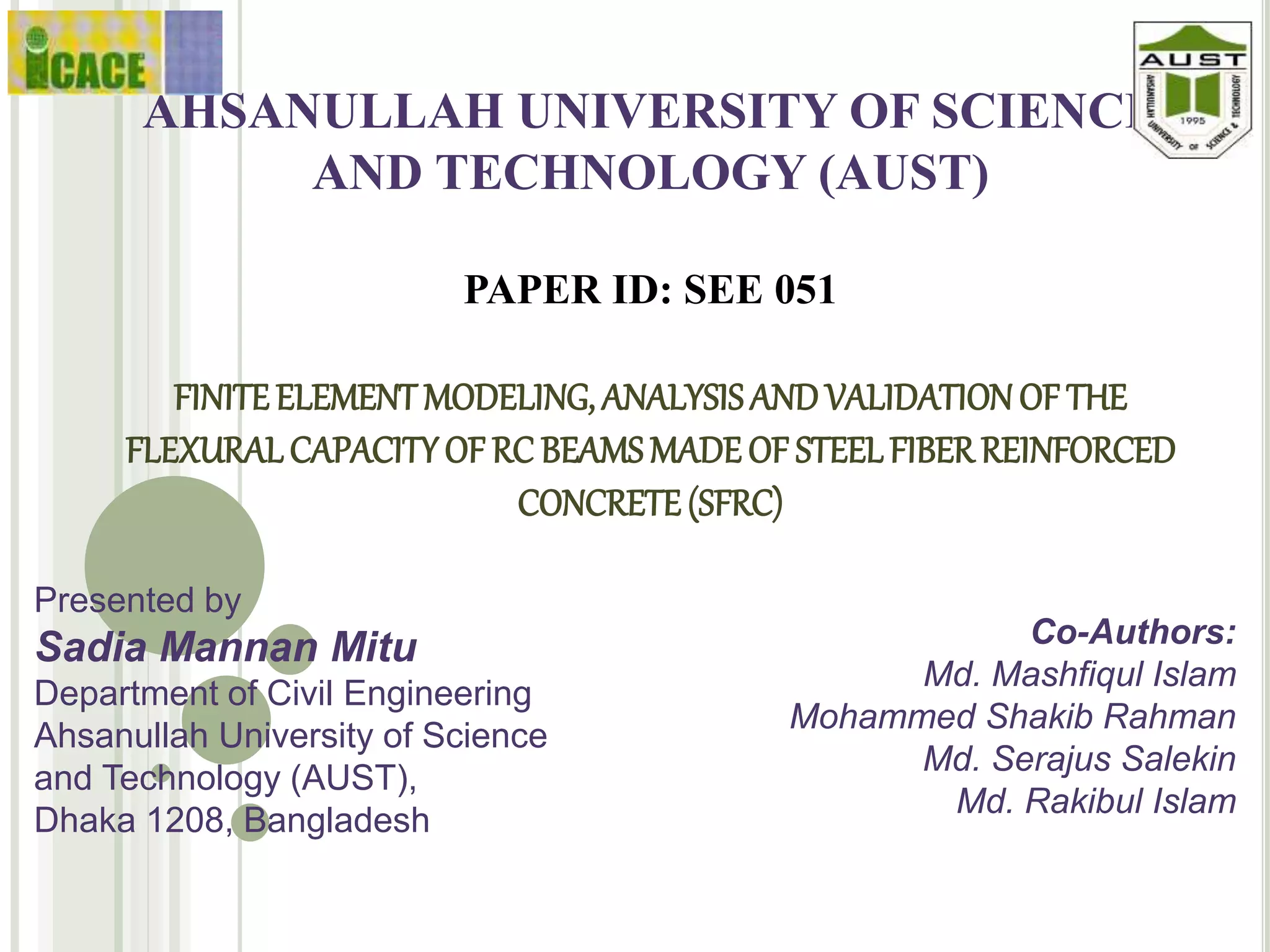 This document presents research on modeling the flexural capacity of steel fiber reinforced concrete (SFRC) beams. It describes an experimental program that tested RC beams with different steel fiber aspect ratios. A finite element analysis was conducted using ANSYS to model the beams. The FE models were validated by comparing their load-deflection behavior and failure patterns to the experimental test results. The research found that adding steel fibers increased the beams' compressive strength, tensile strength, flexural strength, and ductility. The validated FE models can help predict the performance benefits of using SFRC in construction.
