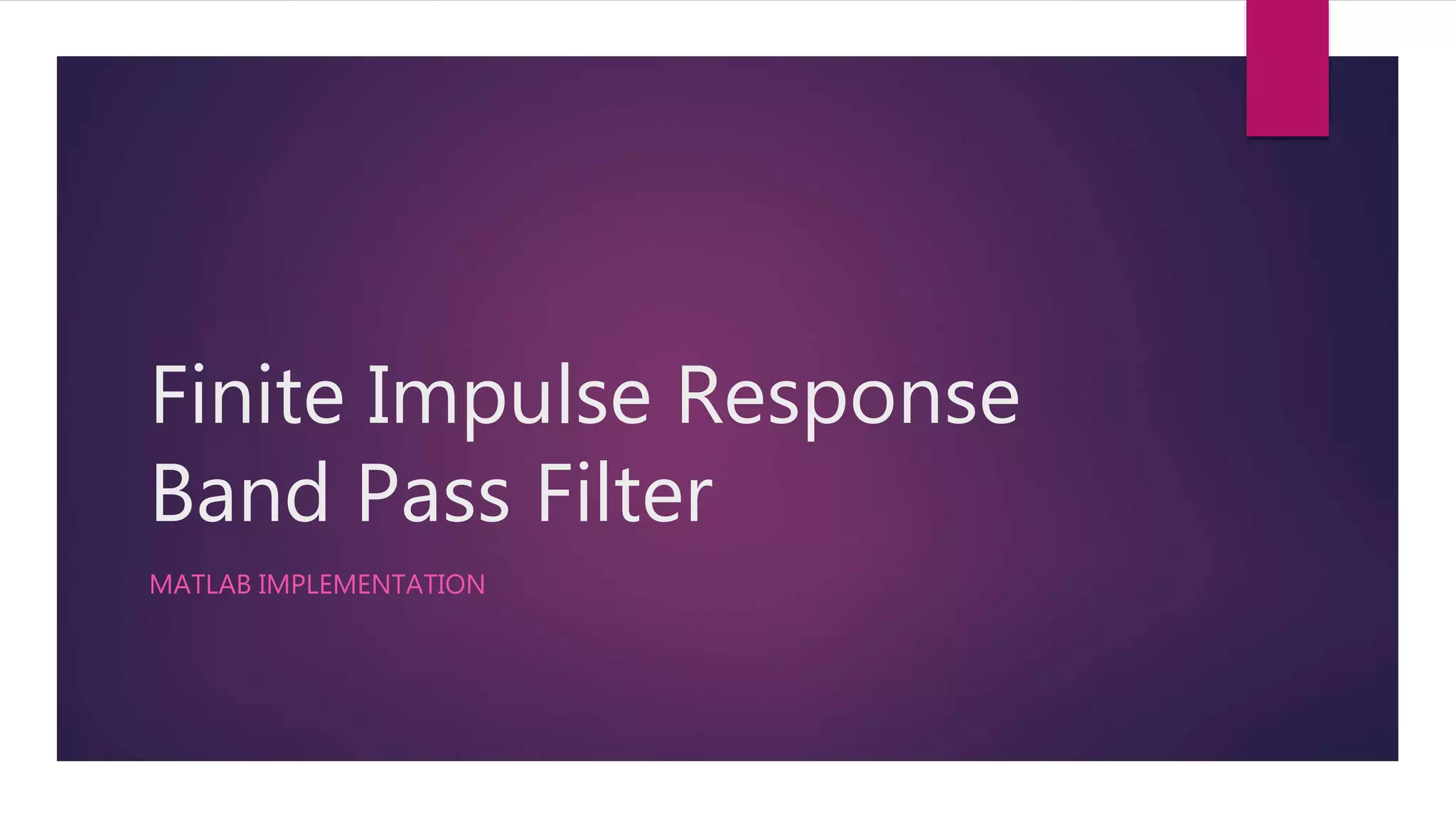 This document discusses the design and implementation of a band pass finite impulse response (FIR) filter in MATLAB. It begins with background on band pass filters and FIR filters. It then states the problem of designing an 11th order band pass FIR filter with a pass band of 4-6kHz using a Kaiser window and sampling rate of 18kHz. The document shows the MATLAB code used to initialize filter parameters, design the Kaiser window, create the FIR filter, and apply it to sample signals to filter between 4-6kHz. It plots the frequency response and filtered output.