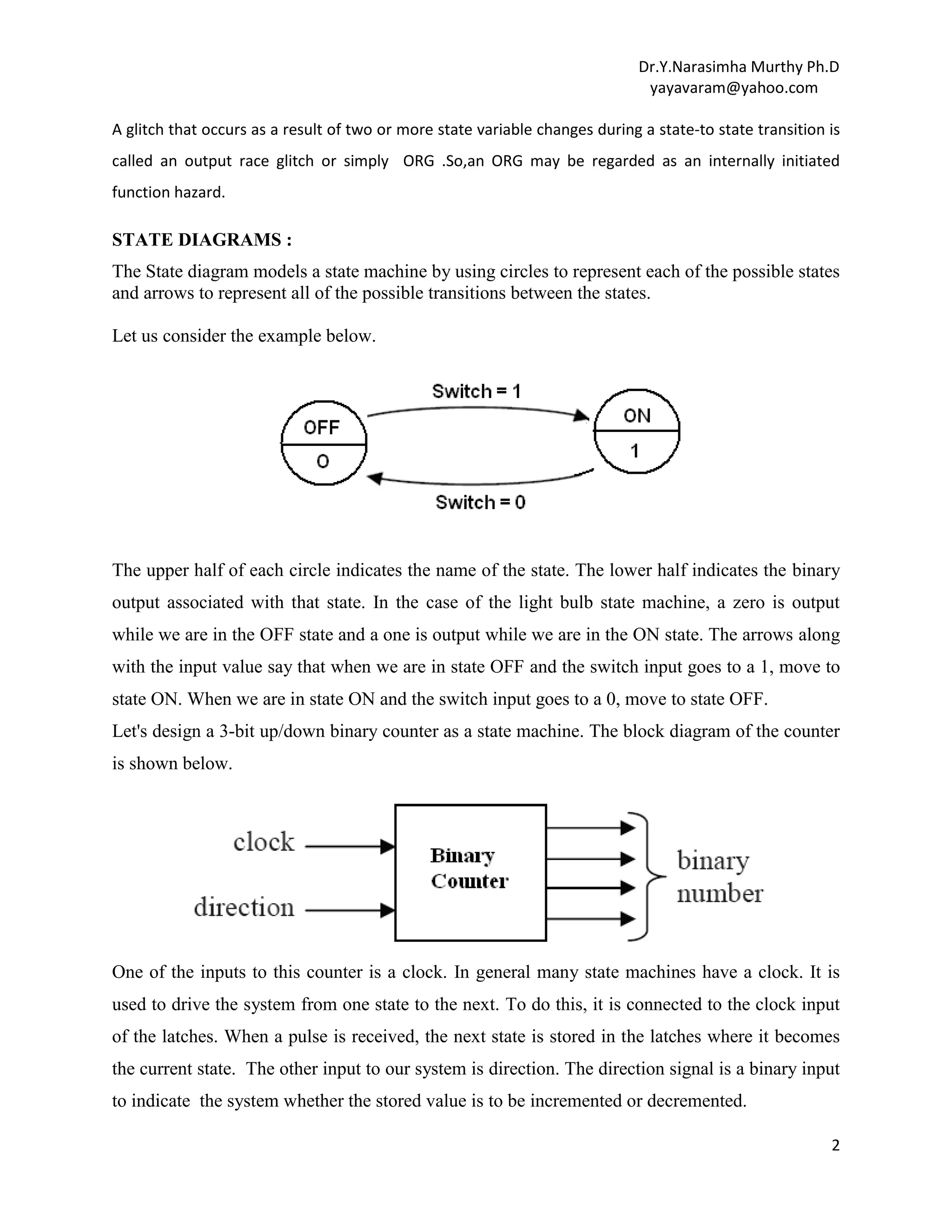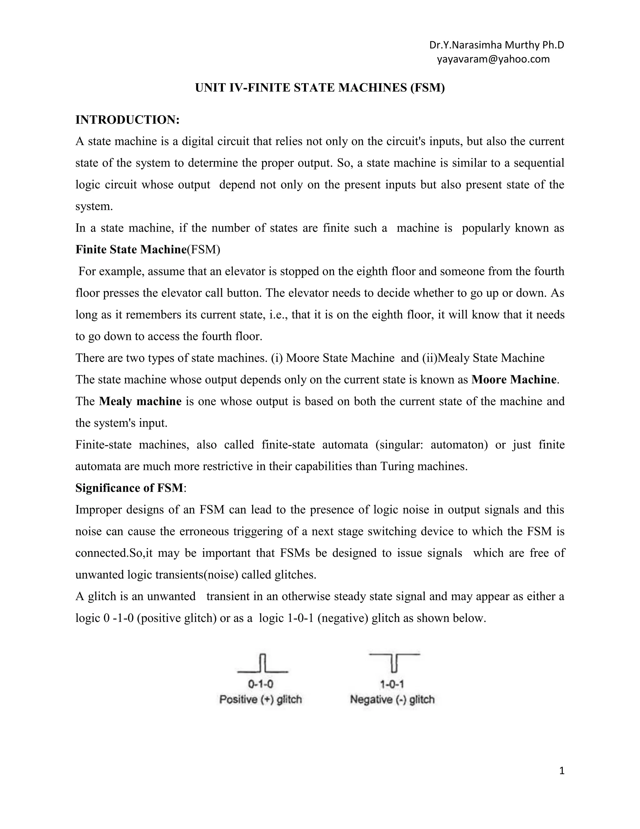 This document provides an overview of finite state machines (FSMs). It defines an FSM as a digital circuit whose output depends on both the current input and state. There are two main types of FSMs: Moore machines whose output depends only on the current state, and Mealy machines whose output depends on both the current state and input. The document discusses state diagrams, state tables, basic circuit organization including latches to represent states and combinational logic for next states and outputs. It also covers topics like state assignment methods including one-hot encoding commonly used to map FSMs onto field programmable gate arrays due to their register-rich architecture.