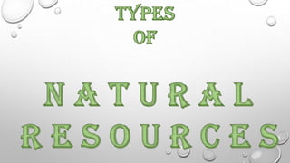 This document defines and discusses the concepts of finiteness, resources, and the finiteness of resources. It states that while resources are abundant in nature, they are finite and limited due to constraints of space, time, and the laws of nature. Both renewable resources like plants and animals and nonrenewable resources like fossil fuels are discussed. The document also provides examples of different types of natural resources like water, soil, minerals, vegetation and animals, and discusses some of their common uses.