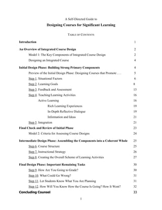 This self-directed guide by L. Dee Fink presents a systematic approach to designing college courses for significant learning, emphasizing the importance of integrating various course components. It outlines three major design phases: initial design (building strong primary components), intermediate design (assembling components into a coherent course), and final design (completing essential tasks). Key steps include analyzing situational factors, setting learning goals, creating feedback and assessment strategies, and ensuring alignment between teaching strategies and learning outcomes.