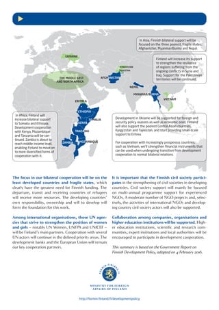 Finland's development policy, outlined in a 2016 government report, aims to reduce poverty and inequality while promoting human rights, gender equality, and climate action. The policy focuses on enhancing the rights of women and girls, strengthening developing economies, supporting democratic societies, and ensuring food security and sustainable resource use. Finland will increase funding for sustainable development, particularly in the poorest and fragile states, and engage with international organizations to enhance cooperation and achieve set goals.