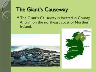 The Giant's Causeway in Northern Ireland is formed from thousands of hexagonal basalt columns created by an ancient volcanic eruption. According to Irish legend, the causeway was built by the giant Finn McCool to allow him to fight his Scottish rival Benandonner. When Benandonner arrived in Ireland, Finn McCool's wife dressed him as a baby to trick Benandonner. When Benandonner saw Finn's enormous "baby", he fled in fear back to Scotland, destroying the causeway behind him and losing one of his giant boots still visible today.