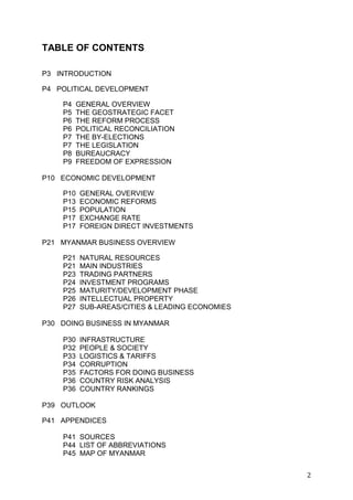 This document provides an overview of the political and economic developments in Myanmar. Politically, Myanmar has transitioned to a civilian government in 2011 after decades of military rule. Key political milestones include Aung San Suu Kyi's landslide victory in the 2012 by-elections and the suspension of most sanctions by the EU and US. Economically, Myanmar remains one of the last frontier markets in Asia, but it is rich in natural resources and undergoing reforms. Geopolitically, Myanmar is strategically located between China and India, and its political opening could shift regional trade routes and make it a hub for energy and trade.