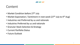 The document outlines a market analysis conducted by the 'wanna be vc' team, highlighting positive market sentiment and significant trends in the BSE Sensex and Nifty 50 as of late July 2017. It includes a granular selection of stocks with both successful investments, like Voltas and Maruti Suzuki, and underperforming ones such as SBI, and discusses the future outlook as potentially bearish if key support levels are breached. The analysis also mentions industry preferences and aversions, addressing factors impacting various sectors including telecom, FMCG, and real estate.