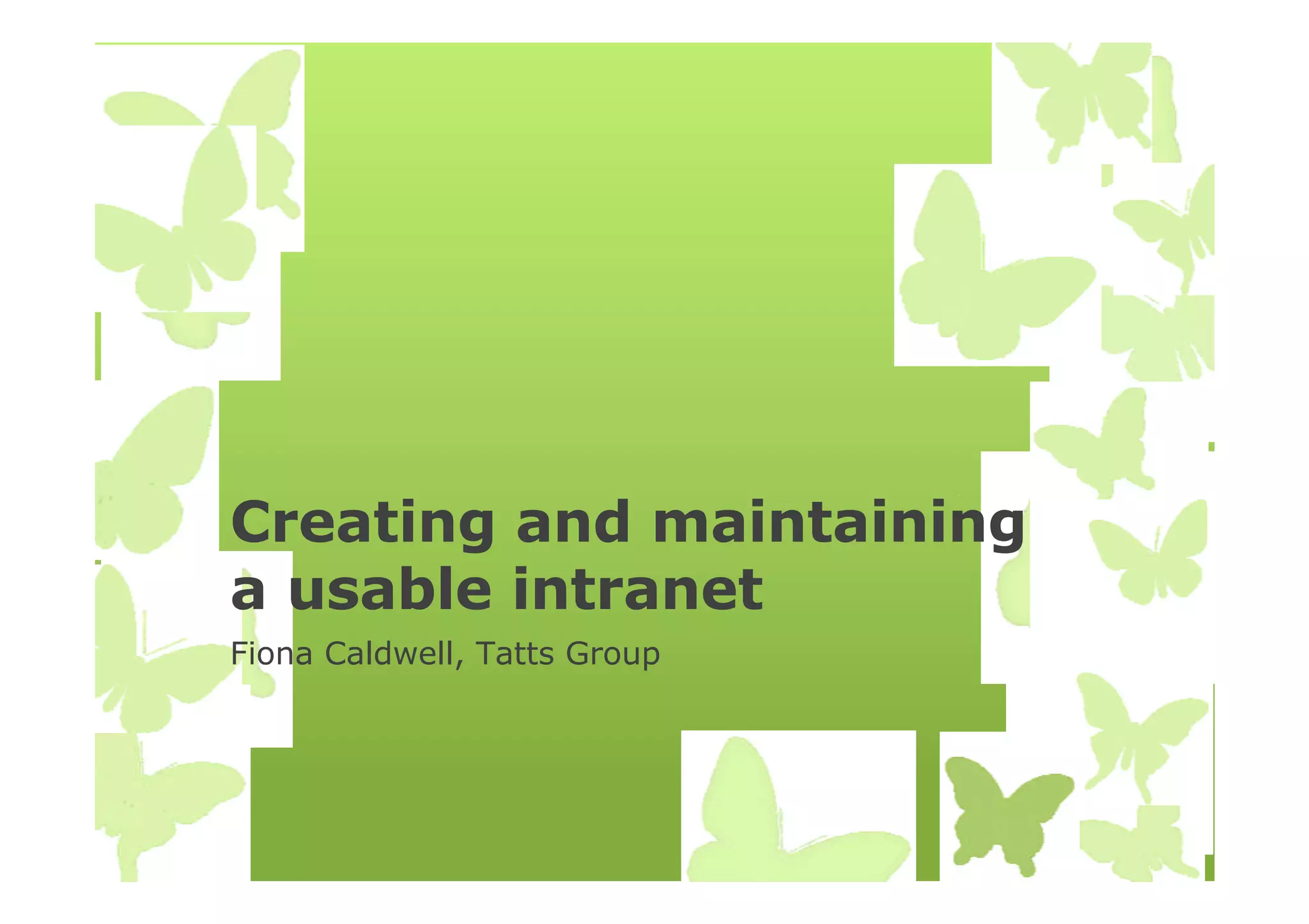 The document discusses best practices for creating and maintaining a usable intranet at Tatts Group, including finding user needs through stakeholder interviews, task scenarios, log and feedback reviews, and usability testing, as well as maintaining content through various authoring models, training, support, communication, and regular content reviews. It is authored by Fiona Caldwell, Group Manager of Business Systems at Tatts Group.