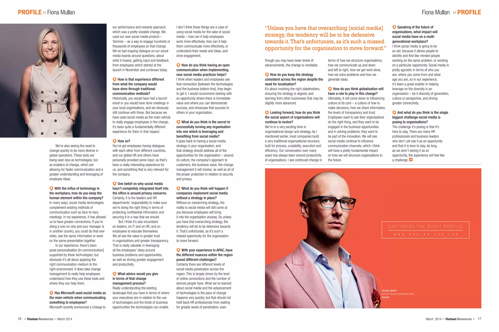 Fiona Mullan is the senior HR director for Microsoft's APAC region. She discusses how social media is challenging traditional organizational structures by enabling more open information sharing. She emphasizes that companies need a clear social media strategy that leverages the technology to improve communication, engagement, and innovation while mitigating risks. She advises starting with high-value uses of social media and demonstrating success to gain support for broader implementation and change management.