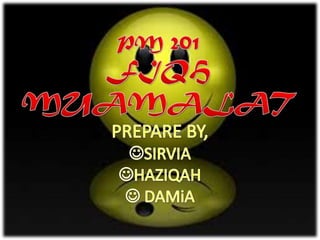 The document discusses the law of khiyar, which allows one or both parties to a contract to cancel the contract within a specified period. Khiyar must be limited to a consecutive period of no more than three days for non-perishable goods. If both parties hold khiyar rights, ownership of goods remains with the seller until the contract is either continued or canceled. If the contract is canceled, ownership remains with the seller, and if continued, it transfers to the buyer. If only one party holds khiyar, that party alone controls ownership of the goods. Damage to goods before receipt transfers ownership, while damage after does not void the sale unless the khiyar holder cancels