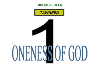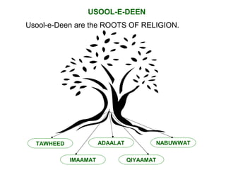 Usool-e-Deen are the roots of religion and include Tawheed (the oneness of God), Adaalat (justice), Qiyamat (judgement day), Nabuwwat (prophethood), and Imaamat (leadership). The document discusses each of these concepts as fundamental principles of religion and notes that on Qiyamat, or Judgement Day, God will pass judgement on all people.