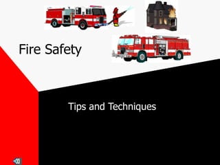 The document provides fire safety tips, including how fire needs heat, fuel, and oxygen to burn and can be put out by removing any one of those elements. It emphasizes the importance of having smoke detectors, making escape plans, practicing fire drills, using the stop-drop-and-roll technique if clothes catch fire, and calling for help from a safe location outside the home rather than going back inside for any reason once evacuated.