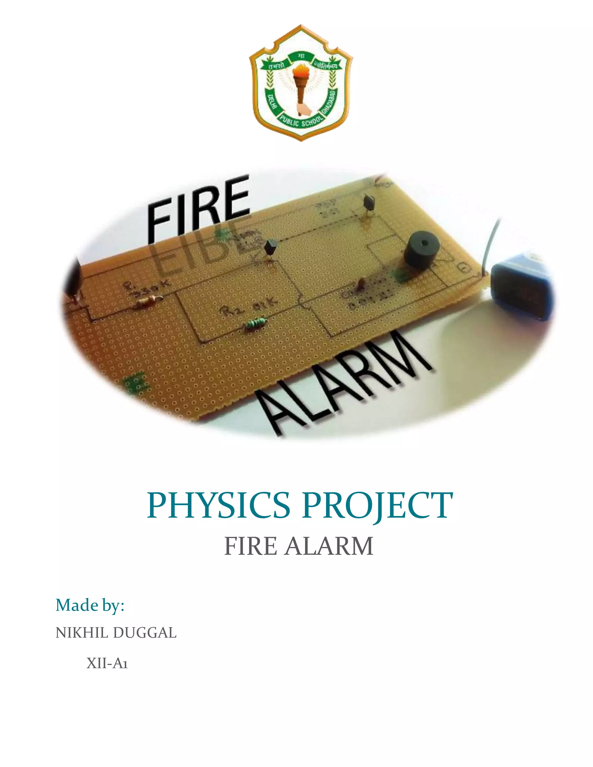 The document details a physics project on an automatic fire alarm system, acknowledging support from various individuals throughout the project. It outlines the objectives, theoretical background, components, working mechanism, observations, and conclusions regarding the fire alarm system's effectiveness. The project emphasizes the importance of fire alarm systems in ensuring life safety and property protection while also noting precautions for handling the circuit components.
