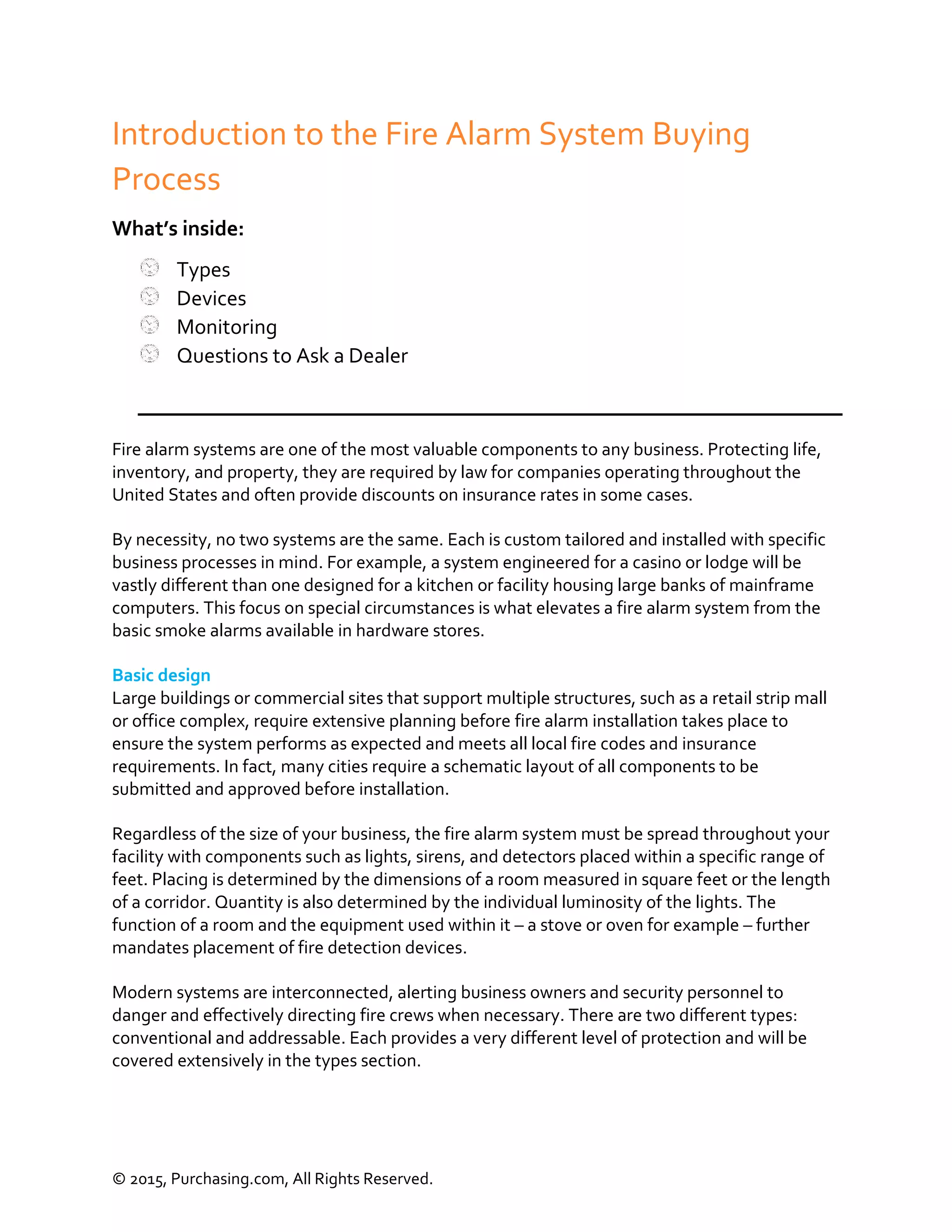 This document provides an overview of fire alarm systems, including types, components, trends, and codes/regulations. It discusses two main types - conventional and addressable systems. Addressable systems can pinpoint the exact location of an alarm but are more expensive, while conventional systems only identify the zone but are more affordable. The document also reviews various components like detectors, control panels, sprinkler systems, boxes, and alerts; and trends like smart systems and integrated technologies. Partnering with a dealer can help ensure the system meets codes and a business's specific needs.
