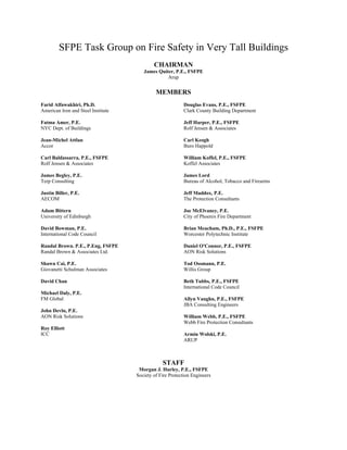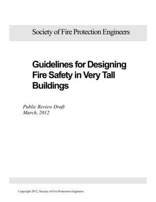 This document provides a draft of guidelines for designing fire safety in very tall buildings produced by the Society of Fire Protection Engineers (SFPE) Task Group. It discusses the history of tall building fires that contributed to the development of high-rise fire safety provisions, outlines international practices, and identifies goals and unique features of tall buildings that should be considered in fire safety design. The guidelines cover topics like hazard analysis, building systems integration, emergency egress, fire resistance, suppression, detection, and issues for first responders.