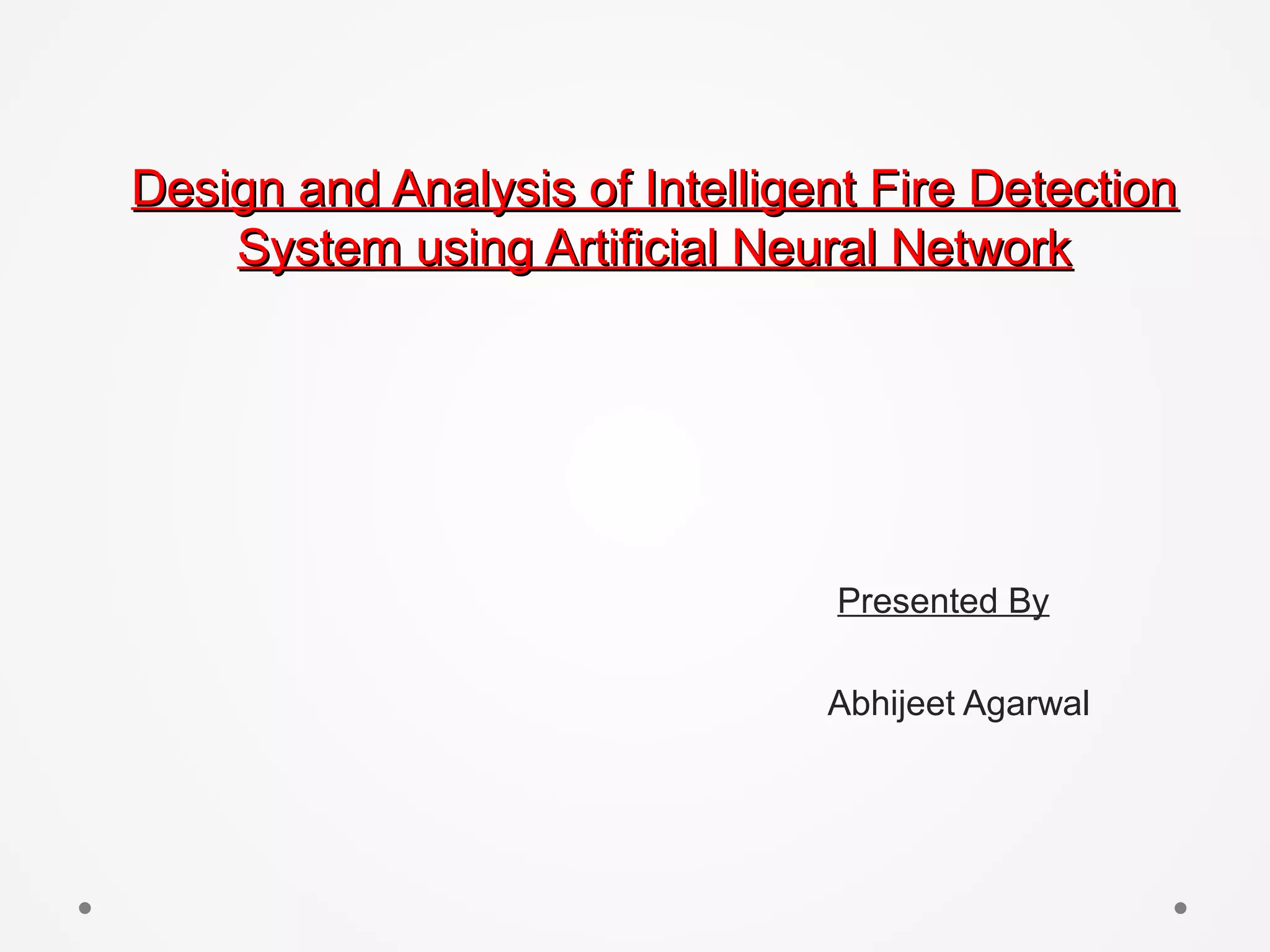 The document presents an intelligent fire detection system utilizing an artificial neural network (ANN) to enhance early fire detection and reduce false alarms compared to traditional systems. By analyzing temperature, smoke, and carbon monoxide concentrations, the ANN achieves high accuracy with low error rates in identifying fire states. The results indicate the system's effectiveness in processing sensor data and improving reliability in fire alarm systems.