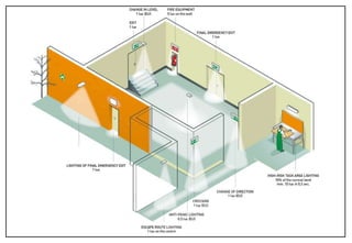 The document outlines comprehensive guidelines on emergency escape lighting systems, including definitions, types, installation standards, and maintenance procedures necessary for ensuring safe evacuations in emergencies. Key components discussed include escape route lighting, open area and high-risk task area lighting, as well as specific regulations and requirements for illuminated safety signs. The document emphasizes the importance of compliance with occupational health and safety standards, building codes, and fire regulations.