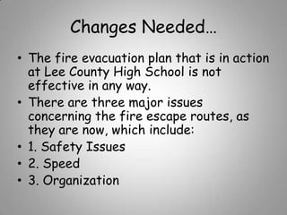 The document proposes changes to the fire evacuation plan at Lee County High School. It identifies three major issues with the current plan: safety, speed, and organization. The proposed changes include designating specific evacuation locations for each building and drawing new routes to address blockages and traffic jams. Diagrams show the campus layout and evacuation routes for each building. The new plan aims to improve safety, speed, and organization during fire drills and emergencies.