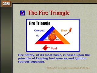 The document provides information on fire safety and fire extinguisher training. It discusses the fire triangle, fuel classifications, and the three most common types of fire extinguishers - water, carbon dioxide, and dry chemical. It explains how to identify the appropriate extinguisher based on the fuel source and use the PASS method to operate an extinguisher. Guidelines are provided on when it is safe to fight a small fire and when to evacuate instead.