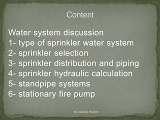 1. Types of sprinkler systems such as wet, dry, pre-action, deluge, and anti-freeze systems. It also discusses standpipe systems.