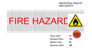 This document discusses fire hazards and classifications. It identifies the three elements of the fire triangle as fuel, heat, and oxygen. Fires are classified into different classes including Class A for solid materials like wood, plastic, and paper; Class B for flammable liquids and gases; Class C for electrical fires; and Class D for combustible metals. Special categories include spontaneously combustible materials and hypergolic reactions. To prevent fires, the key steps are to isolate the fire triangle elements, eliminate ignition sources, properly store flammables, restrict smoking, and periodically check electrical circuits.