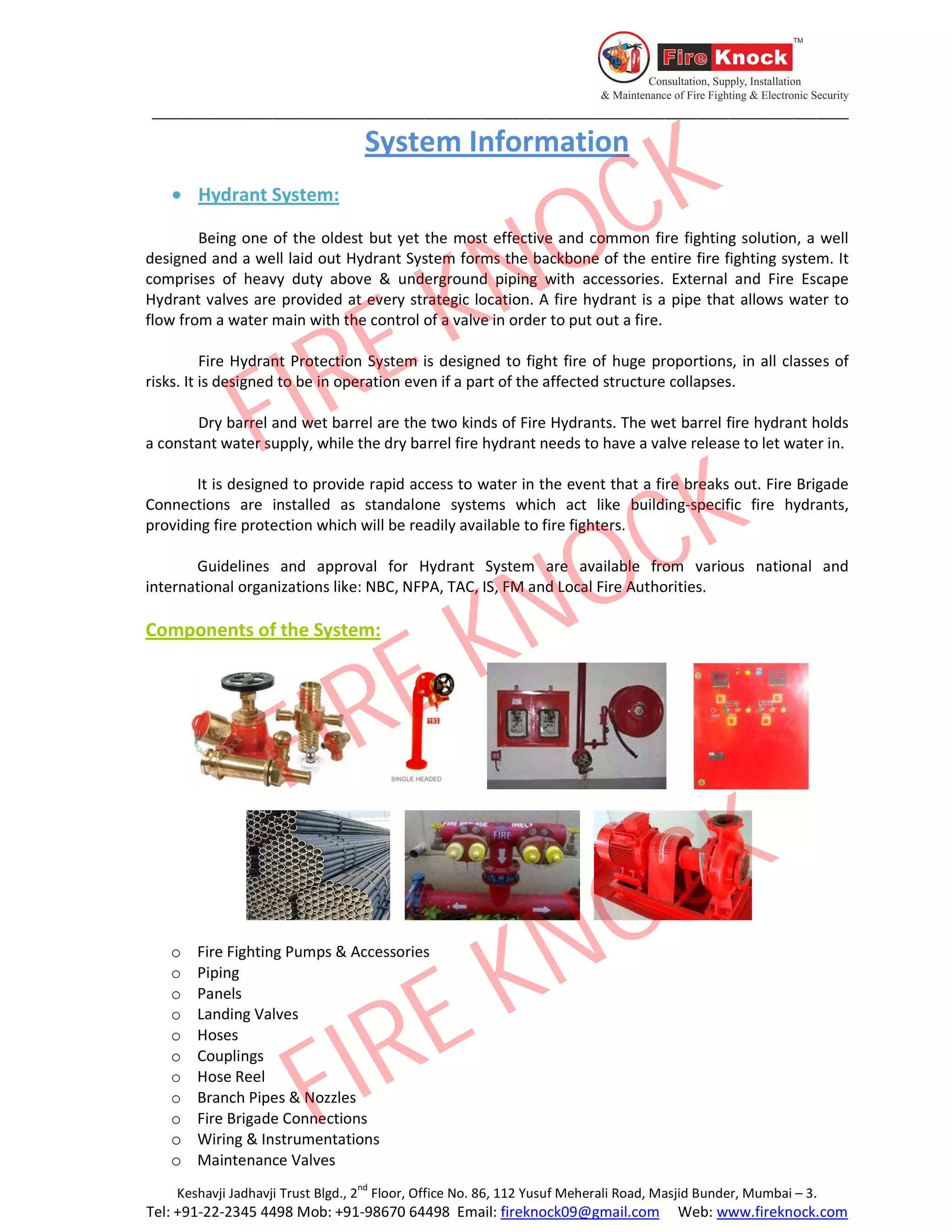 The document provides detailed information about fire hydrant systems, outlining their essential role in firefighting with heavy duty piping and valves for water access. It describes the types of hydrants, operation of fire pumps, and system components necessary for effective fire management. Guidelines and approvals for these systems are sourced from various national and international fire safety organizations.