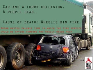 This document provides information on targeting 11-14 year olds and residents of Buckinghamshire for an arson prevention advertising campaign. Research shows the target audience engages in arson due to boredom, attention seeking, and a lack of understanding of consequences. The campaign aims to reduce arson costs in Buckinghamshire through raising awareness of arson's impacts using effective, cost-conscious methods. Focus groups with youths and residents found shocking real-life stories to be most memorable. The campaign will utilize digital media like the internet, TV, and mobile phones to cost-effectively reach a wide audience.