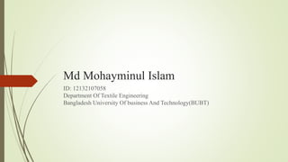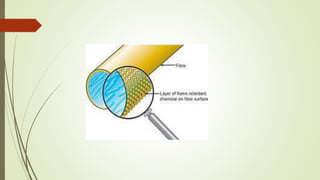 This document defines flame resistant fabrics and discusses their production and properties. It defines flame resistance as preventing or inhibiting combustion when exposed to an ignition source. Flame resistant fabrics use flame retardant chemicals in the fibers or finishes to react with heat and extinguish flames. They are produced using inherently flame resistant fibers, manufactured fibers with added chemicals, or finishes applied to materials like cotton. While providing safety benefits, flame resistant fabrics are typically less comfortable, more expensive, and require extra care than other fabrics.