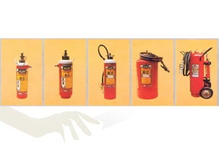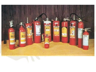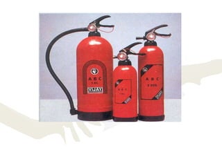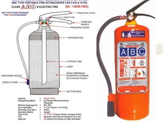 The document discusses fire safety in schools, including the chemistry and growth of fires, fire classifications, fire extinguishers, and rescue procedures. It explains that fire is a chemical reaction that requires fuel, oxygen, and heat. Fires progress through incipient, smoking, flame, and heat stages as they grow. Methods to extinguish fires include starvation, blanketing, and cooling. Portable fire extinguishers use various media like water, foam, dry chemical powder, and carbon dioxide. Proper fire extinguisher use follows the PASS method of pull, aim, squeeze, sweep. Precautions after escaping a fire include sealing cracks and covering vents. Rescue procedures involve feeling doors and openings for heat before entering