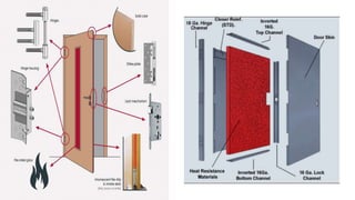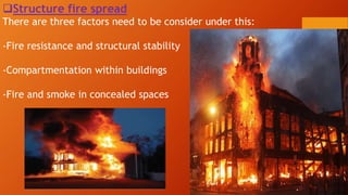 This document discusses different types of fire spread including internal, surface, and structure fire spread as well as external fire spread between buildings. It also discusses factors that influence each type of spread such as material properties, compartmentation, and roof coverings. The document then summarizes input and output devices for fire detection and alarm systems including manual pull stations, heat, smoke, flame, and gas detectors as well as how they function. It also provides a block diagram of a typical fire detection and alarm system. Finally, it briefly discusses smoke and heat venting systems and their components as well as sprinkler systems and classifications of fire extinguishers.