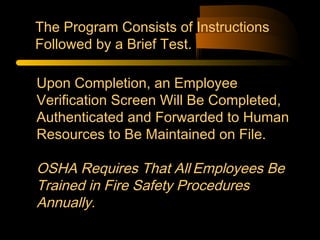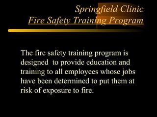 This document outlines a fire safety training program for employees of Springfield Clinic. It provides instructions on fire safety procedures including: using the RACE acronym for responding to a fire of rescuing individuals, pulling the alarm, containing the fire, and evacuating or extinguishing the fire if possible. It details the evacuation plan, use of fire extinguishers, and annual training requirements for employees.