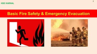 This document provides an overview of basic fire safety and emergency evacuation procedures. It covers topics such as the components and spread of fire, classification of fires, firefighting equipment like extinguishers and hydrants, methods of firefighting, fire prevention and protection measures, fire alarm systems, and emergency evacuation procedures. The key aspects are identifying the components required for a fire, understanding how fires spread, learning about different types of firefighting equipment and methods, and knowing the proper procedures to follow during a fire emergency or evacuation.
