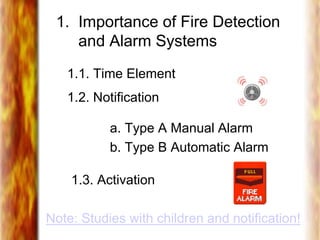 This document discusses fire detection and alarm systems as well as fixed fire suppression systems. It covers various types of fire detectors including heat, smoke, and flame detectors. It also describes different types of sprinkler systems such as wet-pipe, dry-pipe, pre-action, and deluge systems. Key components of sprinkler systems like water supplies, piping, valves, alarms and sprinkler heads are explained. Placement and spacing of sprinklers depends on occupancy hazard classification. Other fixed suppression systems like carbon dioxide, dry chemical, and foam systems are also outlined.