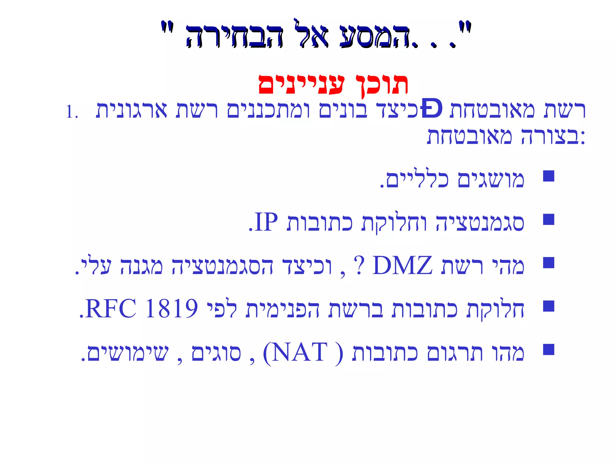 תוכן עניינים רשת מאובטחת – כיצד בונים ומתכננים רשת ארגונית בצורה מאובטחת : מושגים כלליים . סגמנטציה וחלוקת כתובות IP. מהי רשת DMZ ? , וכיצד הסגמנטציה מגנה עלי . חלוקת כתובות ברשת הפנימית לפי RFC 1819. מהו תרגום כתובות ( NAT) , סוגים , שימושים . " המסע אל הבחירה . . ."