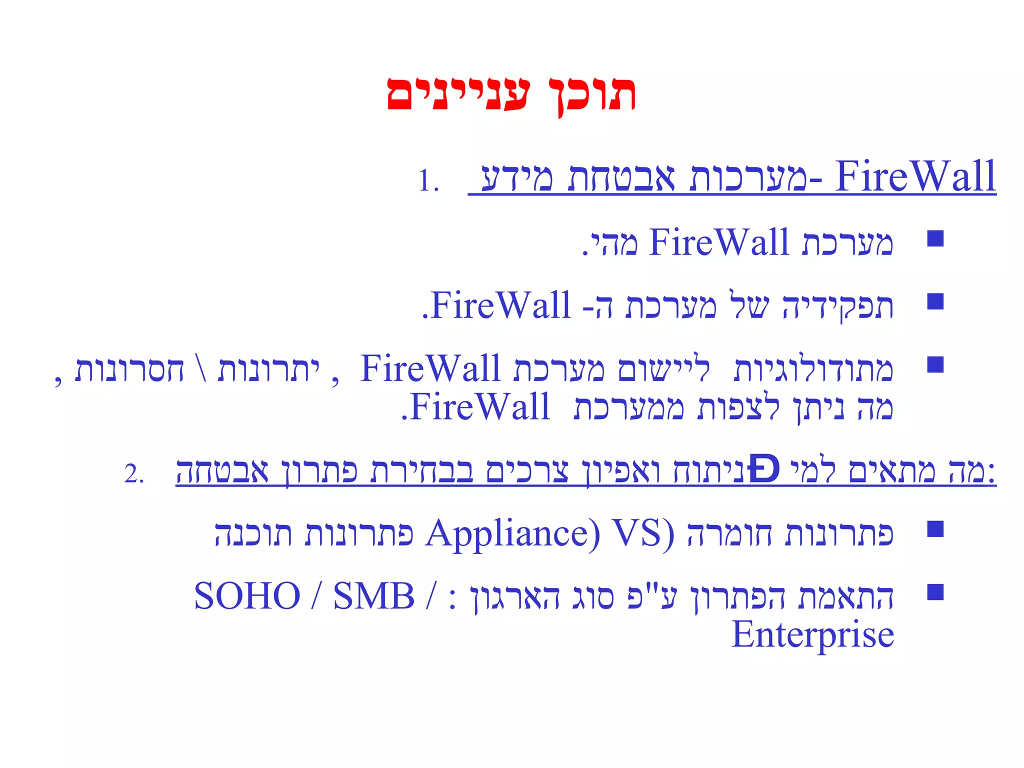 תוכן עניינים מערכות אבטחת מידע - FireWall מערכת FireWall מהי . תפקידיה של מערכת ה - FireWall. מתודולוגיות ליישום מערכת FireWall , יתרונות \ חסרונות , מה ניתן לצפות ממערכת FireWall. מה מתאים למי – ניתוח ואפיון צרכים בבחירת פתרון אבטחה : פתרונות חומרה (Appliance) VS פתרונות תוכנה התאמת הפתרון ע " פ סוג הארגון : SOHO / SMB / Enterprise