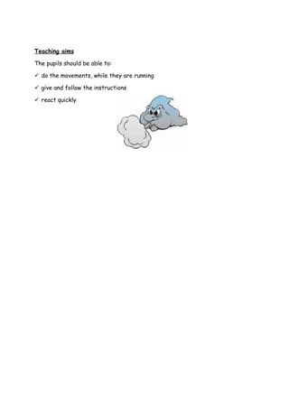 The document describes a physical education activity where children run in the gym while singing songs. One child is selected as the "teacher" who shouts commands like "fire", "water", or "wind" that correspond to different actions for the other children to quickly perform, such as lying on the floor, climbing a fireman's pole, or crawling under a bench. The last child to complete the action becomes the new teacher. The activity aims to have the children practice doing movements while running, giving and following instructions, and reacting quickly.