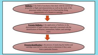 This document discusses principles and practices of firearm identification in forensic science. It defines key ballistics terms and describes how class and individual characteristics can be used to identify firearms. Specific characteristics examined include rifling marks, firing pin impressions, breech face marks, and striations. Methods of comparing bullets and cartridge cases using comparison microscopes, stereomicroscopes, test firing, and automated databases like NIBIN and IBIS are summarized. The document provides an overview of the field of forensic ballistics and firearm identification.