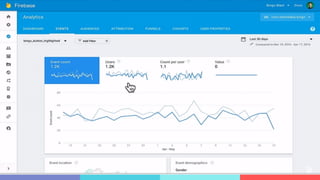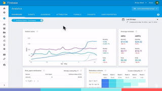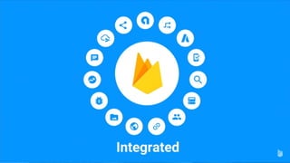This document provides an overview of using Firebase to develop a mobile application. It discusses that Firebase handles many backend tasks like authentication, databases, file storage, analytics and more. This allows developing mobile apps with a smaller team as backend engineers are not needed. The document also summarizes key Firebase features like real-time sync, offline support, security, and hosting. It provides code examples for authentication, databases and storage.