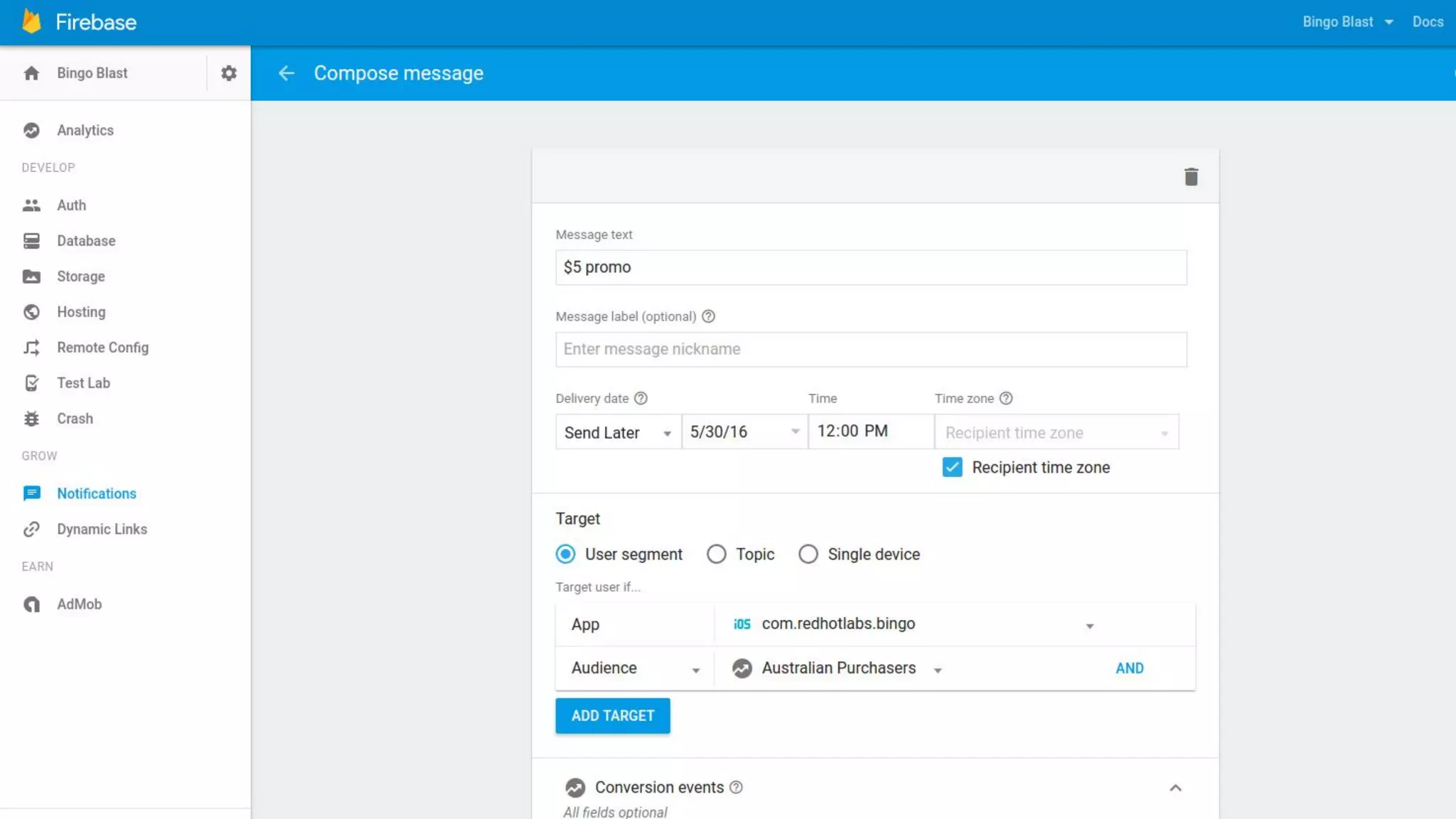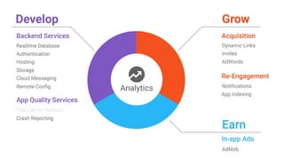 This document discusses Firebase and its services for iOS applications. It provides an overview of the Firebase SDK and how to get started, including creating a Firebase project, configuring libraries, and integrating services like Cloud Messaging, Database, Authentication and more. It also briefly explains how to send notifications and events using Cloud Messaging from a server.