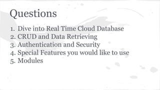 The document provides an overview of Firebase, a cloud database and backend service founded in 2011, focusing on real-time data synchronization for mobile and web applications. It covers key features such as CRUD operations, authentication methods, security configurations, and the pros and cons of using Firebase. The conclusion emphasizes the need for developers to think independently and explore Firebase's capabilities.