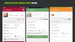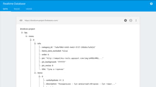The document discusses using Firebase Realtime Database and Remote Config in a pattern-based mobile app for food ordering. Firebase Remote Config allows modifying app configuration like colors, text and features without an app update. Firebase Realtime Database provides real-time synchronization of data like menus across client and server to avoid out of sync issues during intermittent connectivity. Both services help reduce developer workload and speed up new feature deployment and A/B testing.