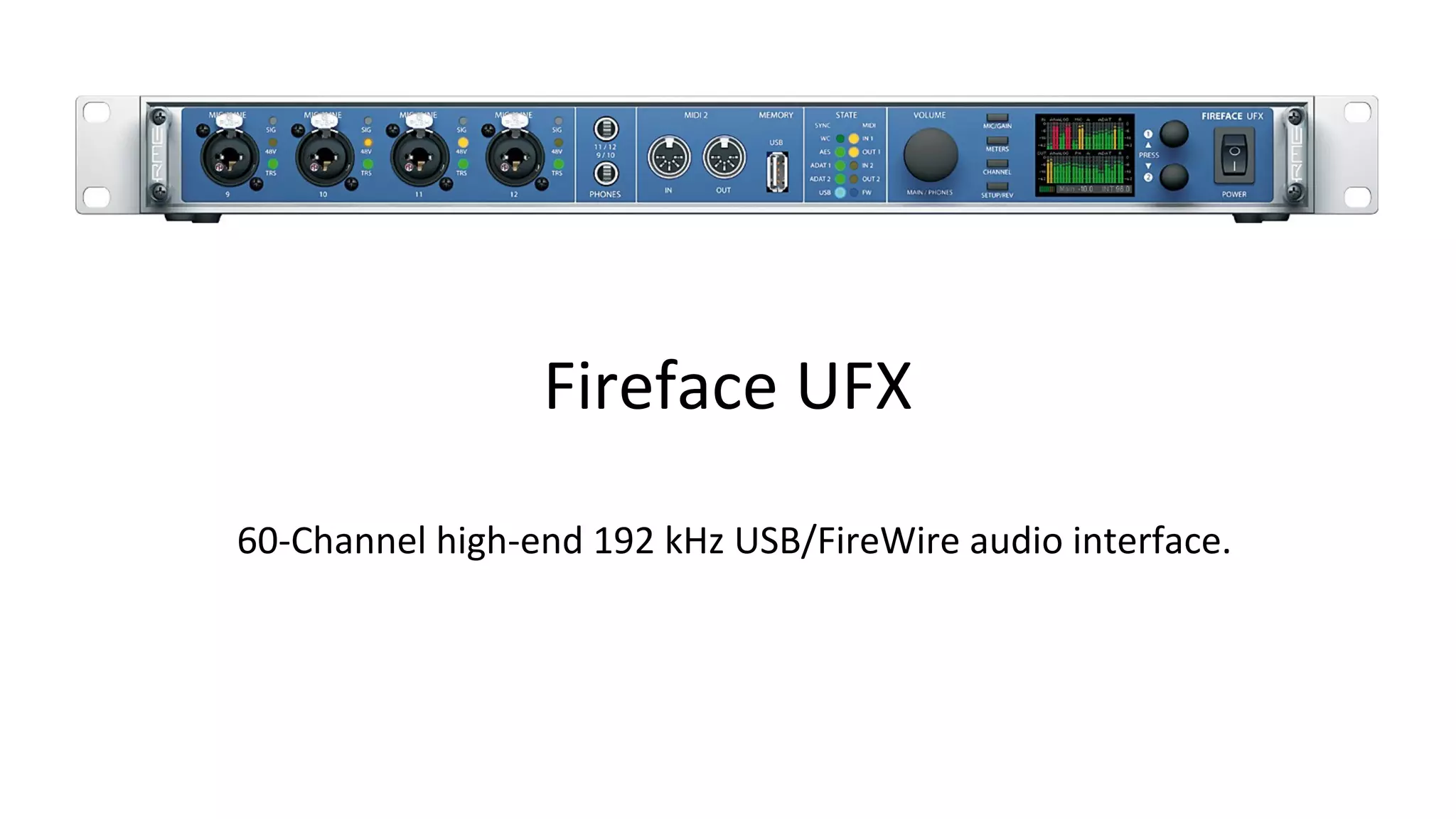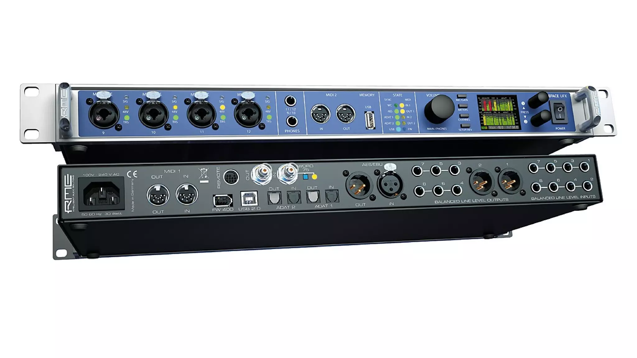 The Fireface UFX is a high-end 60-channel 192 kHz audio interface with 12 analog inputs/outputs, 4 digitally controlled mic/instrument preamps, AES/EBU, ADAT, and SPDIF I/O. It features RME's TotalMix FX mixer, monitor controller, effects processing, and ultra-low latency USB and FireWire connectivity. The interface is controlled via its front panel color display and knobs, providing comprehensive metering, routing, and configuration in a single rack-mount unit.