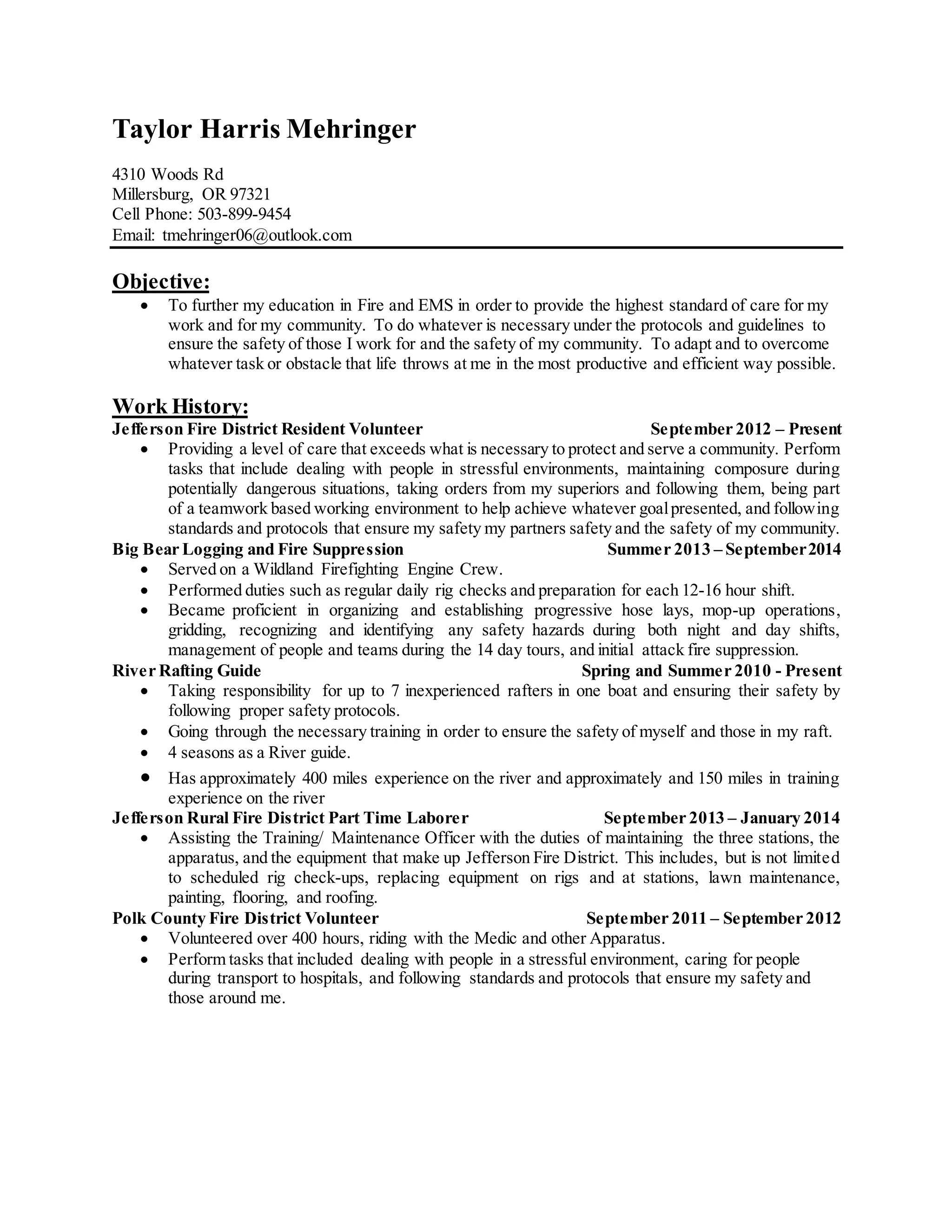 Taylor Harris Mehringer is seeking to further his education in fire and EMS to provide the highest standard of care. He has over 6 years of experience as a volunteer firefighter and EMT, as well as experience as a wildland firefighter and rafting guide. Mehringer has obtained numerous certifications including EMT-B, Firefighter I/II, vehicle extrication, and swift water rescue technician. He aims to adapt and overcome challenges to ensure community safety.